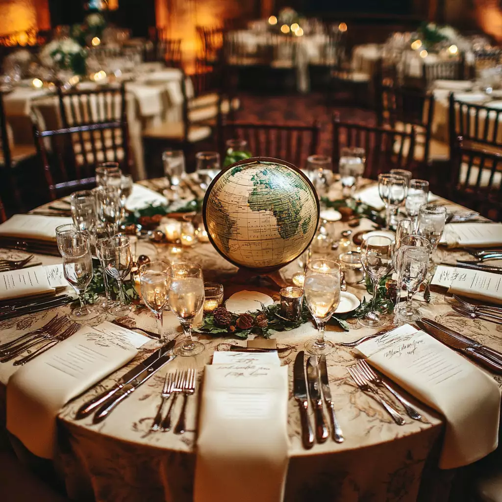 The travel theme also offers countless opportunities to design your wedding in this style. Stationery—from seating plans to menus—can be perfectly coordinated with this style, reflecting your love's journey in the wedding decor.