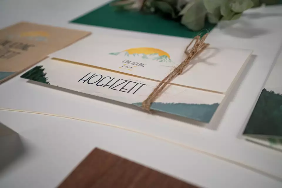 And for the nature-loving among you, there's romantic-rustic inspiration from the mountains and nature, with delicate green tones, sun motifs, and rustic details like cords and charms. This design speaks for itself—modern, inviting, and full of symbolism for couples who want to combine their love of nature with their wedding.