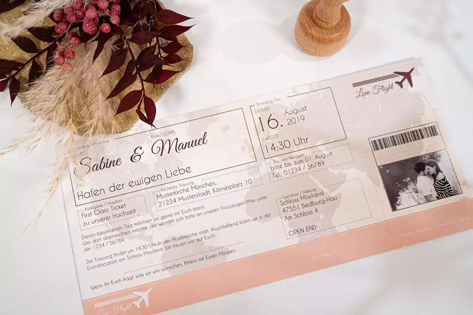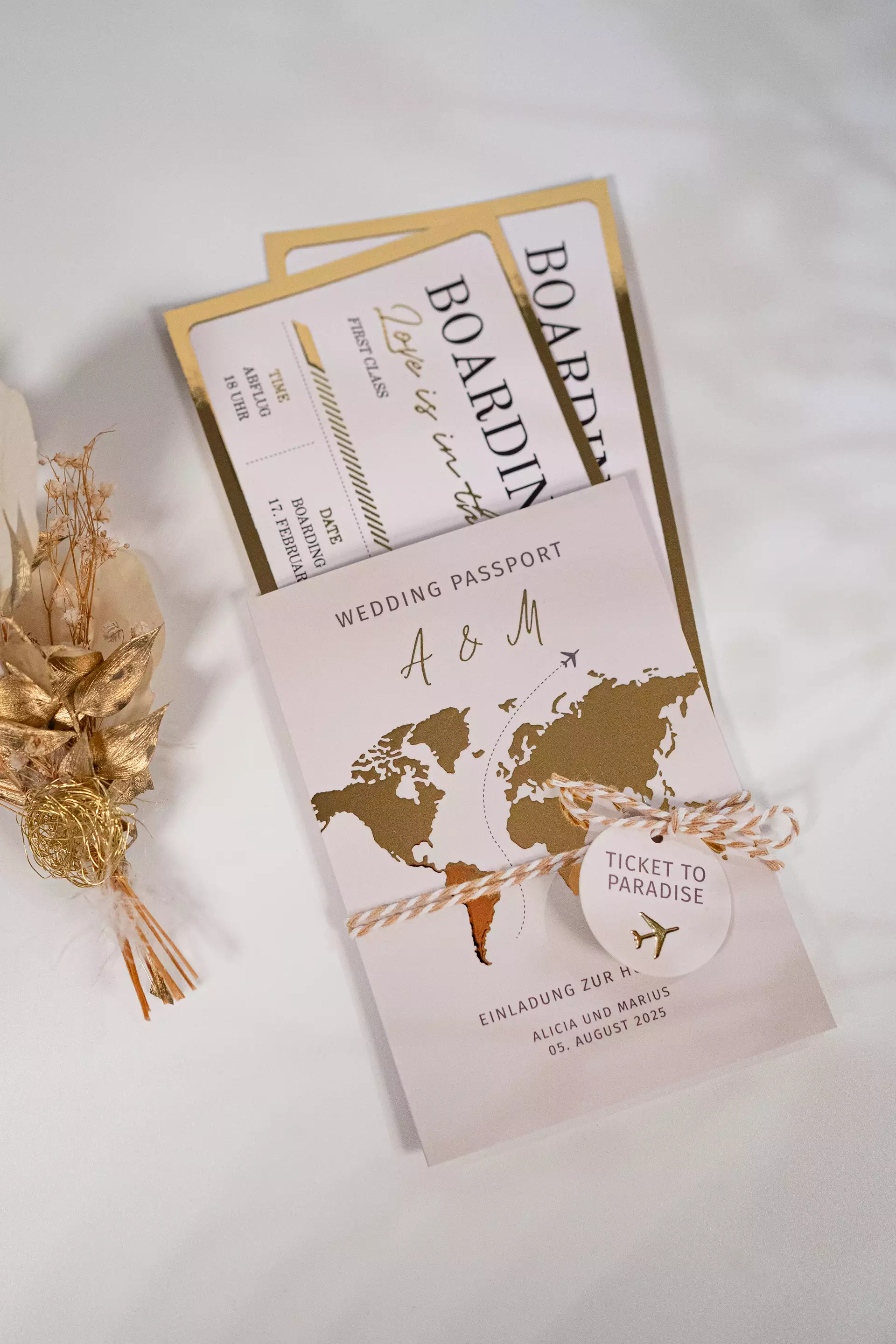 Your table decorations can also be stylishly adapted to this theme. Menu cards in a boarding pass design, or name cards with airplanes or mountains, fit seamlessly into the travel theme. It lovingly reflects the passion for travel. This creates a successful common thread that doesn't have to stop with the invitation or save-the-date cards.