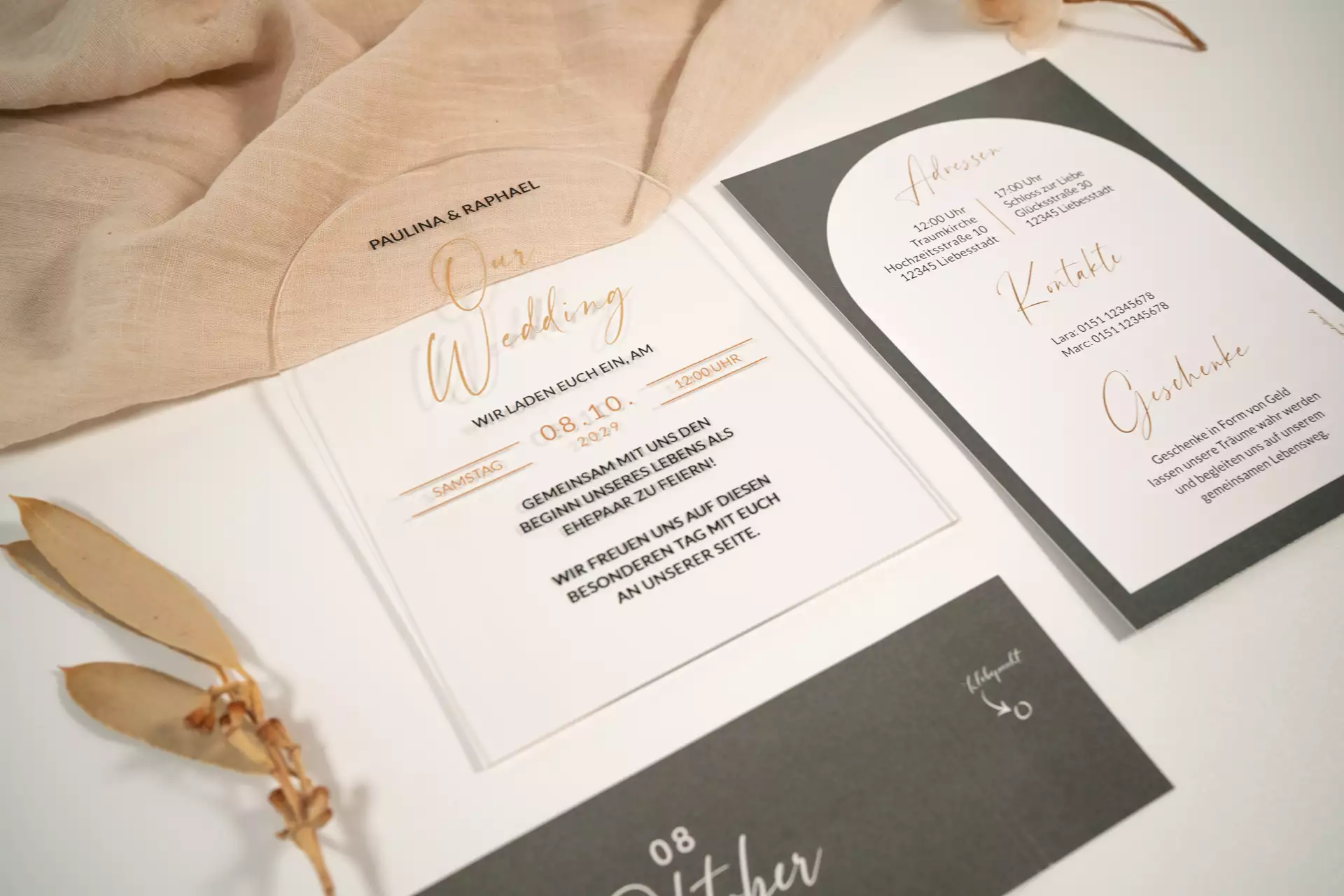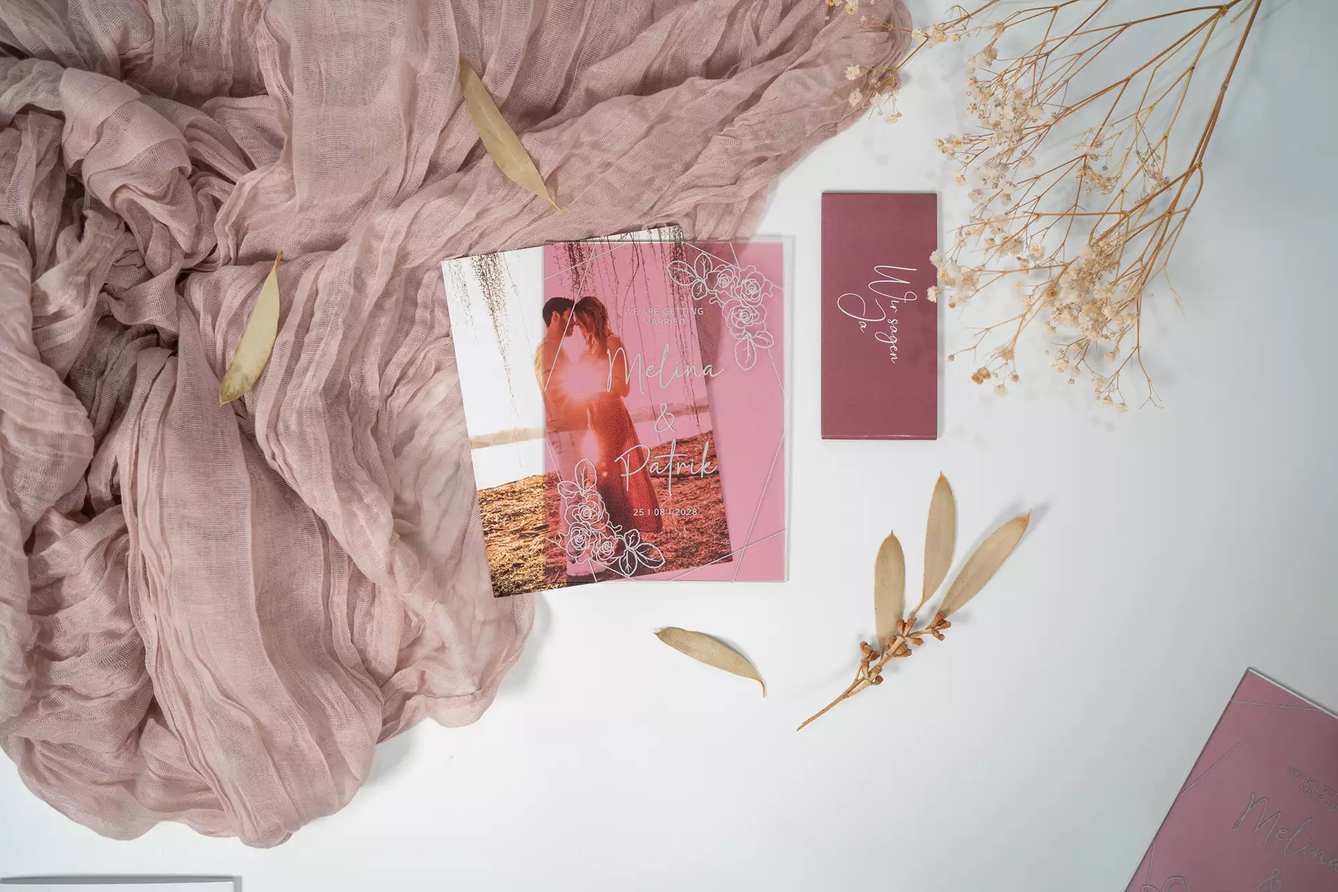Als aanvulling op de uitnodigingen versterken acryl onderzetters, menukaarten en plaatskaartjes het evenementconcept op indrukwekkende wijze. Deze extra elementen combineren functionaliteit met stijlvolle verfijning: acryl onderzetters beschermen niet alleen de tafels, maar voegen ook elegante accenten toe die de algehele uitstraling versterken. Menukaarten Ze presenteren het culinaire aanbod in een moderne look en geven het diner een bijzondere touch, terwijl plaatskaartjes bijdragen aan een persoonlijke en eigentijdse tafelindeling. Samen creëren deze producten een harmonieus totaalbeeld dat verder gaat dan conventionele decoraties en de viering een onderscheidende, exclusieve sfeer geeft.